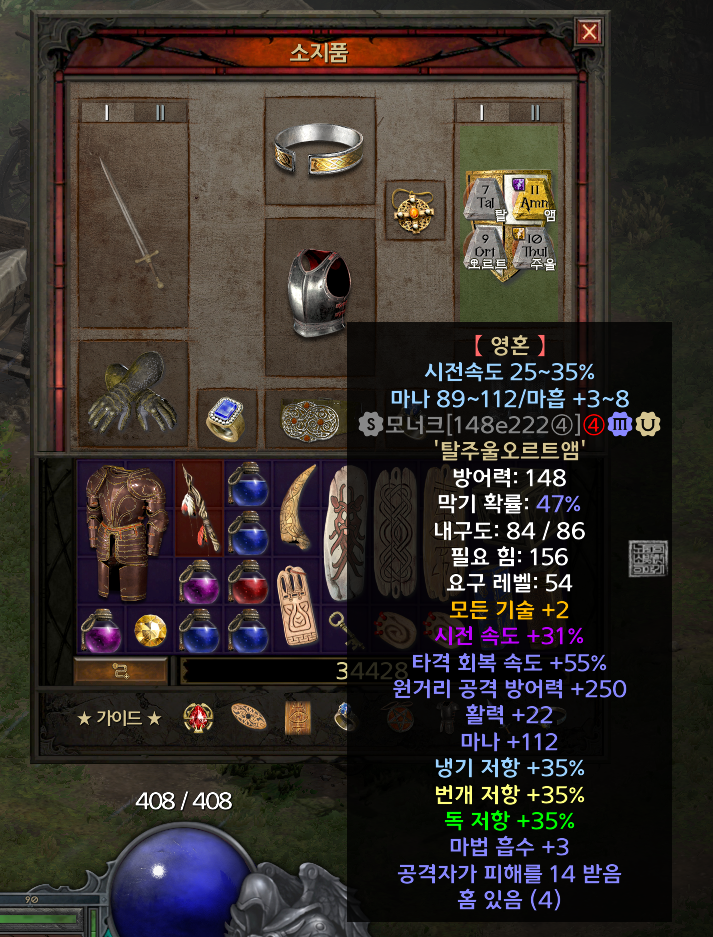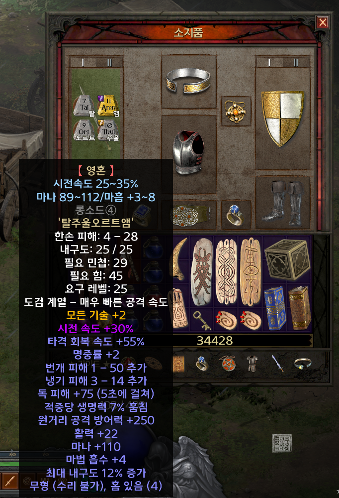 <디아블로2 레저렉션>에서 시나리오 퀘스트를 빠르게 공략하는 과정에서 바바리안을 제외한다면 모든 캐릭터가 꼭 소유해야 하는 건 위 사진에서 볼 수 있는 룬워드 영혼이다. 나는 악몽을 모두 공략할 때까지 영혼 베이스가 되는 롱소드와 룬을 구하지 못한 탓에 지옥 액트2를 공략하면서 겨우 롱소드에 영혼을 만들 수 있었다.