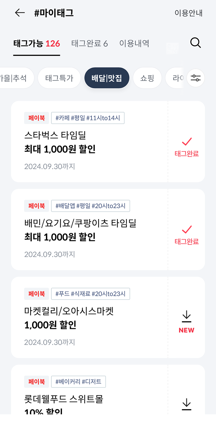 과거 어떤 정치인이 스타벅스는 서민이 찾는 공간이 아니라고 하면서 뭇매를 맞았는데, 페이북 마이태그 할인에서는 평일 오전 11시부터 오후 2시 사이에 스타벅스를 찾아 결제할 경우 최대 1천 원 할인을 받을 수 있다. 그리고 오직 CU 편의점에서만 평일 오전 8시부터 오전 11시 사이에 결제할 경우 최대 1천 원 할인을 받을 수 있었다.