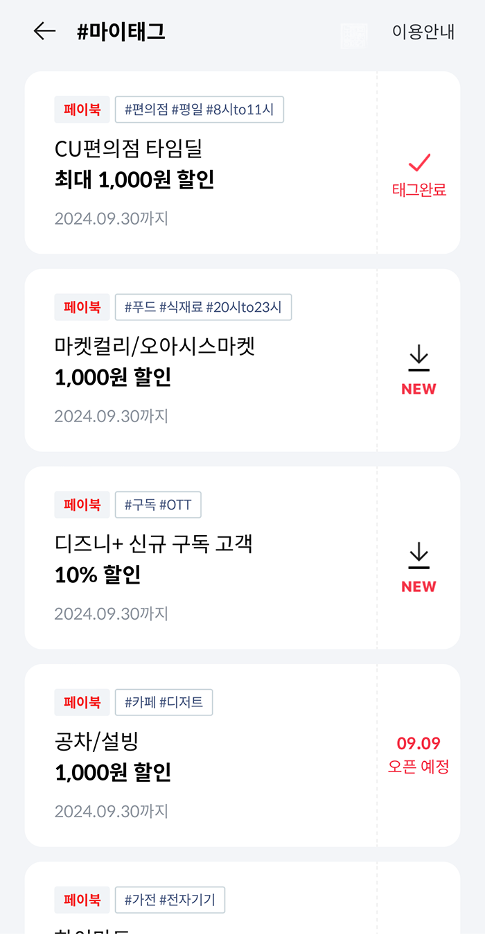 이런 부분도 꼼꼼히 챙겨서 스타벅스와 CU 편의점을 찾는 데에 이용한다면 쏠쏠한 할인을 받을 수 있으니 참고하자. 공차와 설빙 1천 원 할인 마이태그는 9월 9일(월)을 맞아 오픈될 예정이라고 표기되어 있었다. BC카드 페이북 마이태그 할인은 항상 매달 1일에 열리는 마이태그 할인만 아니라 추후 열리는 마이태그 할인도 적지 않다.