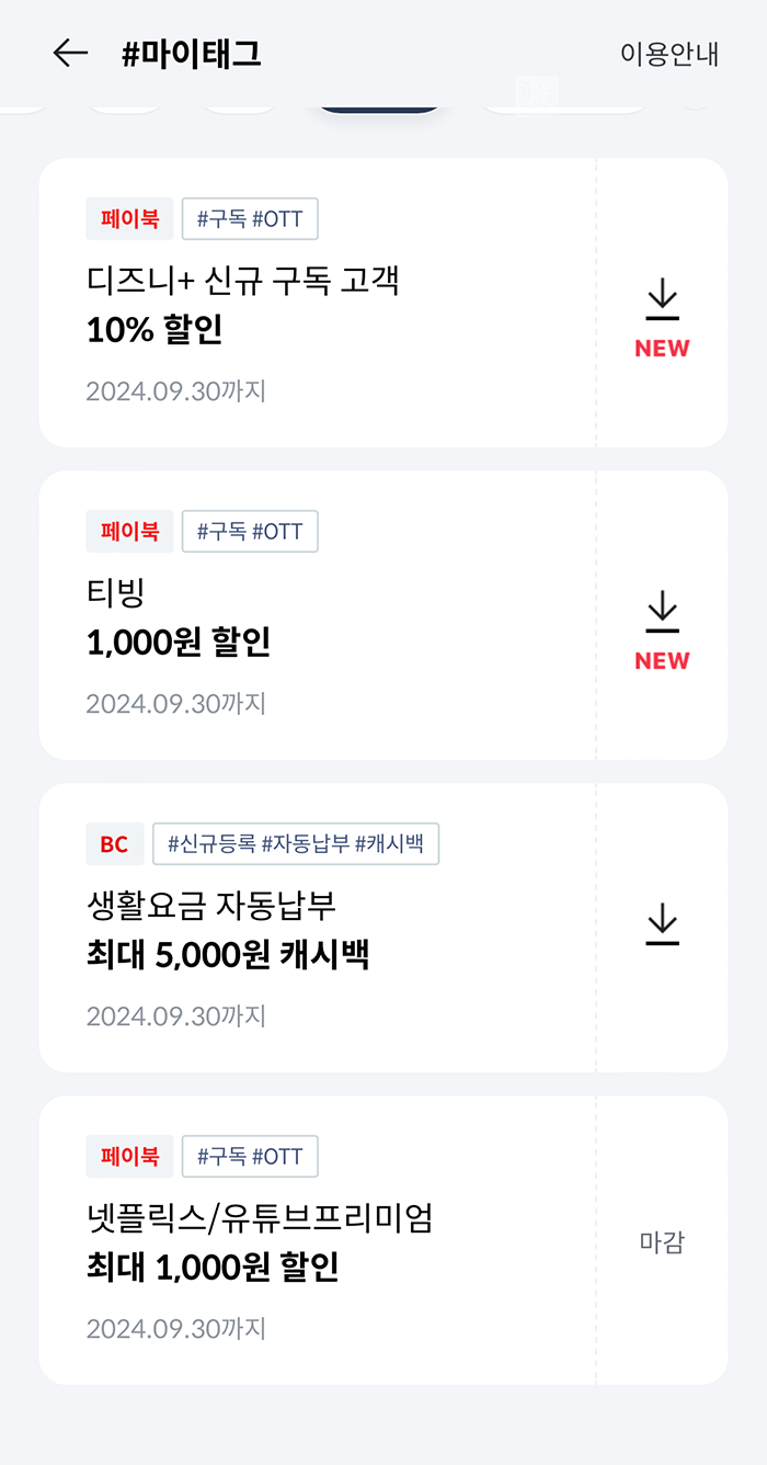 9월이 시작된 이후 BC카드 사용자들이 이용하는 페이북 어플에서는 새롭게 마이태그 할인이 열렸다. 나는 페이북 마이태그를 해야 한다는 사실을 9월 1일이 아니라 9월 2일에 깨닫고 하루 늦게 페이북 어플에 접속했는데, 역시나 다를까 넷플릭스/유튜브 프리미엄 최대 1,000원 할인 마이태그는 진작에 마감이 되어 있었다.