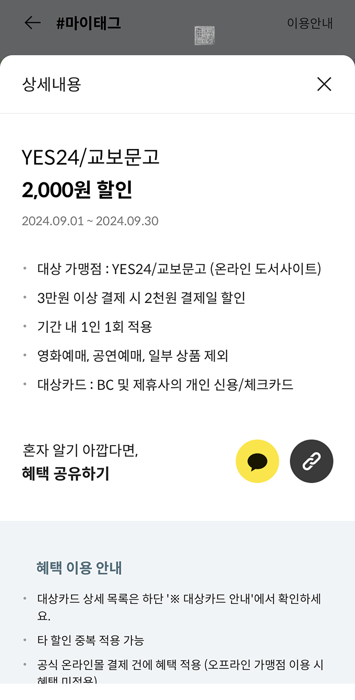 개인적으로 이번에 마주한 BC카드 페이북 9월 할인 목록 중에서 마음에 들었던 건 예스24와 교보문고에서 3만 원 이상 결제 시 2천 원 결제일 할인을 받을 수 있는 마이태그다. 평소 내가 사용하는 소비의 80%는 예스24에서 책을 구매하는 소비이기 때문에 예스24에서 책을 구매할 때 3만 원 이상 카트에 담아야 할 이유가 생겼다.