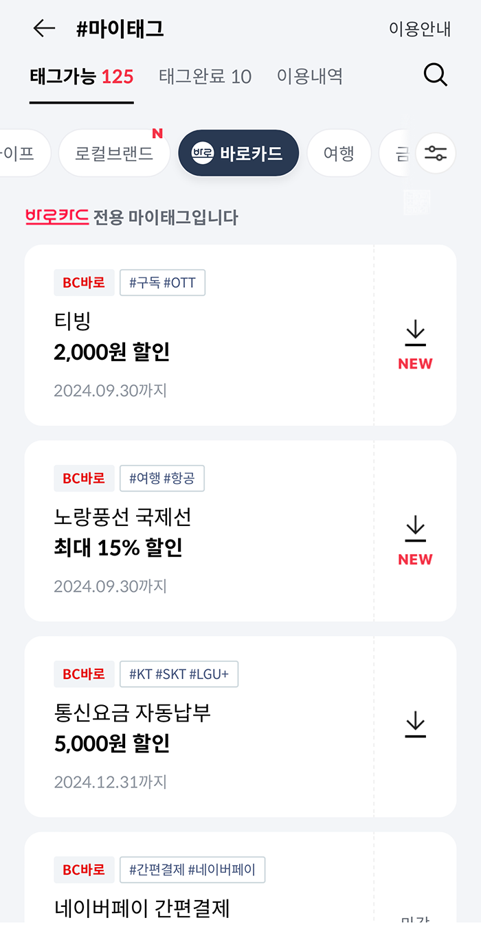 티빙을 보는 사람들이나 디즈니 플러스 신규 구독 고객은 인원이 적은 건지 아직 마이태그가 활성화되어 있는 것을 확인할 수 있었다. 만약 평소 BC카드를 사용하면서 OTT 서비스를 구독하고 있다면, 비록 500원~1,000원이라고 해도 마이태그를 통해서 할인을 받을 수 있으니 절대 놓치지 말자. 이런 데에서 아껴야 한다.