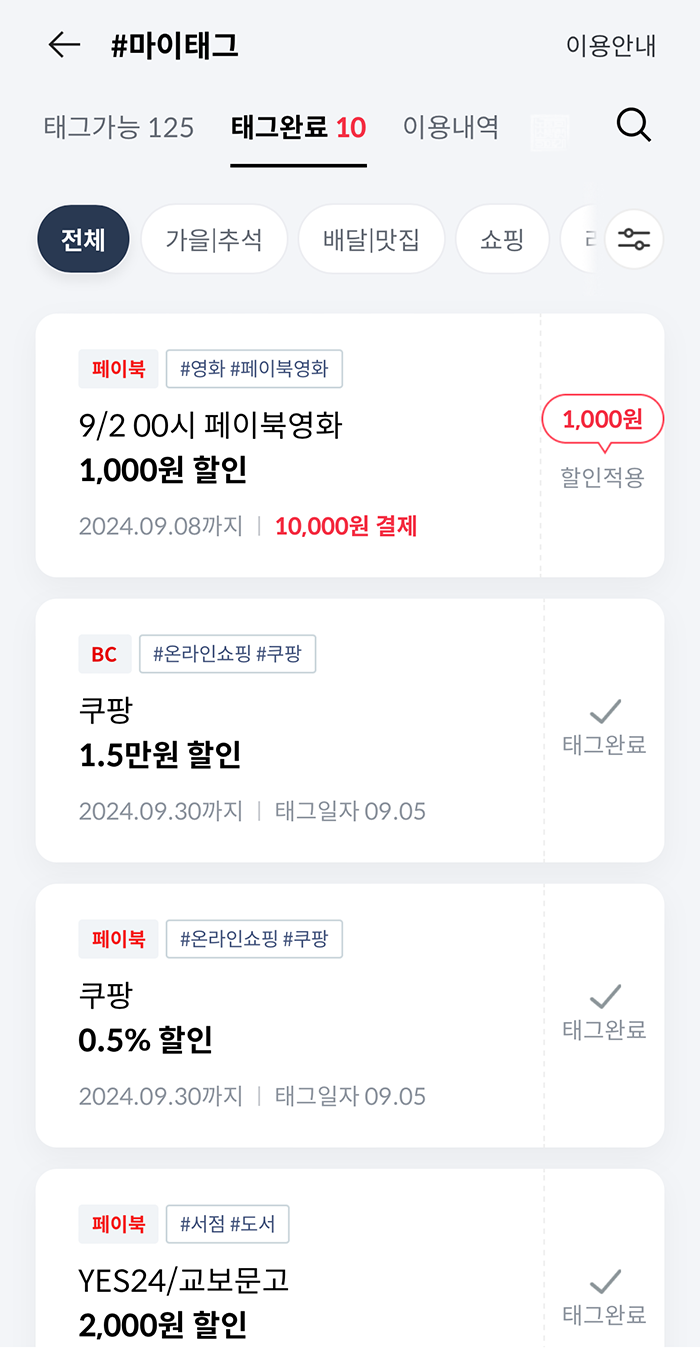 만약 일반 BC카드가 아니라 BC바로카드를 사용하고 있을 경우에는 추가로 할인을 받을 수 있는 마이태그가 있으니 참고하자. 내가 이번에 받은 마이태그 할인은 '태그완료' 탭을 통해서 확인할 수 있는데, 나는 영화 <한국이 싫어서>를 보는 데에 이용했던 페이북 영화 1천 원 할인 적용이 되었다는 것을 태그완료 탭을 통해 확인할 수 있었다.