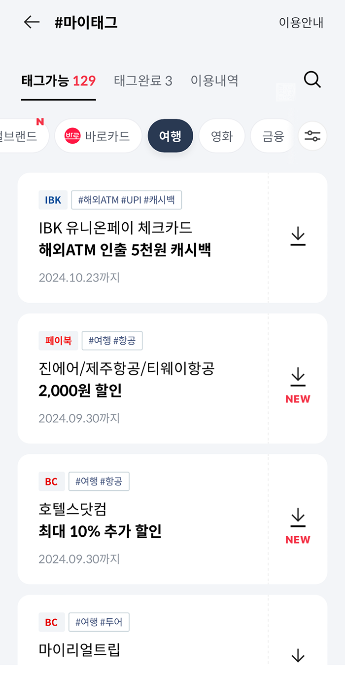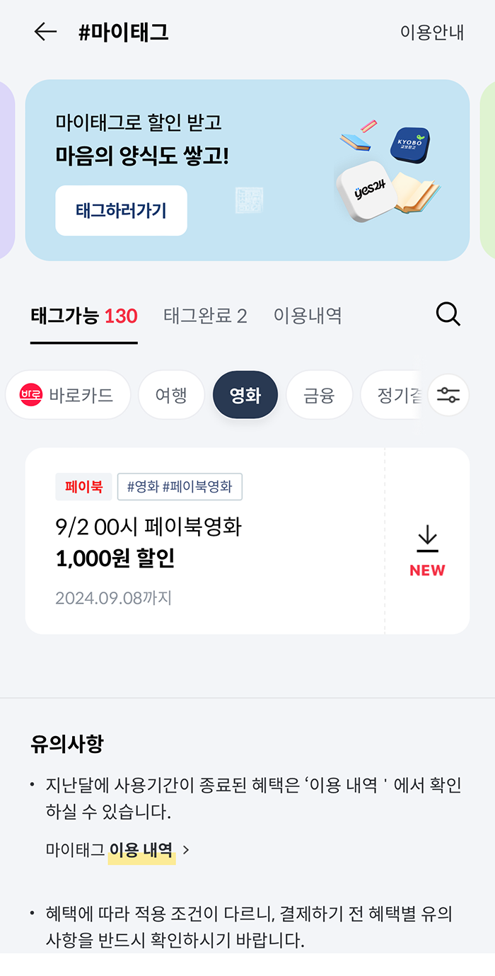 만약 일반 BC카드가 아니라 BC바로카드를 사용하고 있을 경우에는 추가로 할인을 받을 수 있는 마이태그가 있으니 참고하자. 내가 이번에 받은 마이태그 할인은 '태그완료' 탭을 통해서 확인할 수 있는데, 나는 영화 <한국이 싫어서>를 보는 데에 이용했던 페이북 영화 1천 원 할인 적용이 되었다는 것을 태그완료 탭을 통해 확인할 수 있었다.