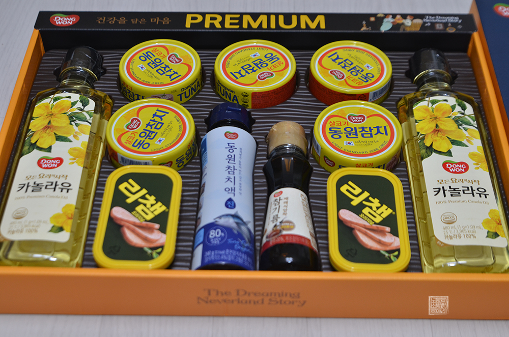 이번에 체육회에서 도착한 동원 선물세트는 동원 프리미엄 62호로, 위 사진에서 볼 수 있듯이 라이트 스탠다드 동원참치(90g) 5개와 리챔 오리지널(120g) 2개가 들어가 있었다. 그리고 리챔만 아니라 여러 가지를 굽는 데에 사용할 수 있는 카놀라유(450ml) 두 개와 함께 참기름, 참치액이 들어가 있어 알뜰하게 잘 갖춰진 구성이었다.