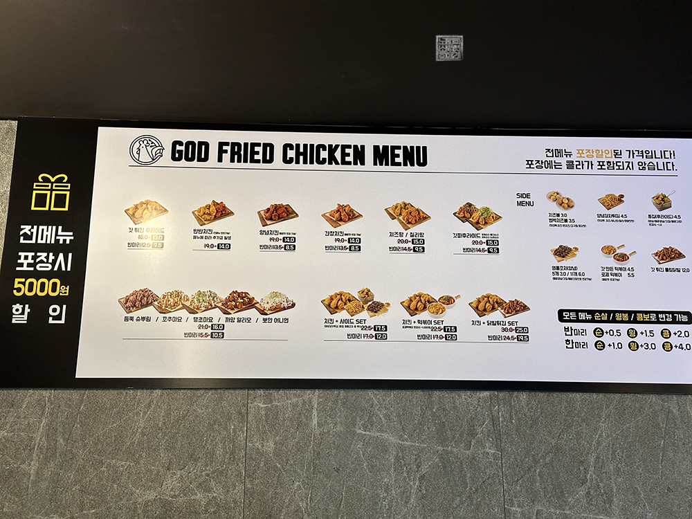 포장 주문을 할 때 앱이 편한 사람들은 배달의 민족과 쿠팡이츠 등을 통해서 예약하는 경우가 많은데, 앱으로 포장 주문을 한다면 가격이 전부 할인이 안 되거나 할인 쿠폰을 적용해야 할인이 되는 것 같았다. 하지만 전화로 예약할 경우 앱에서 일일이 쿠폰을 적용하지 않고도 할인된 가격으로 먹고 싶은 치킨을 주문할 수 있어서 편리했다.