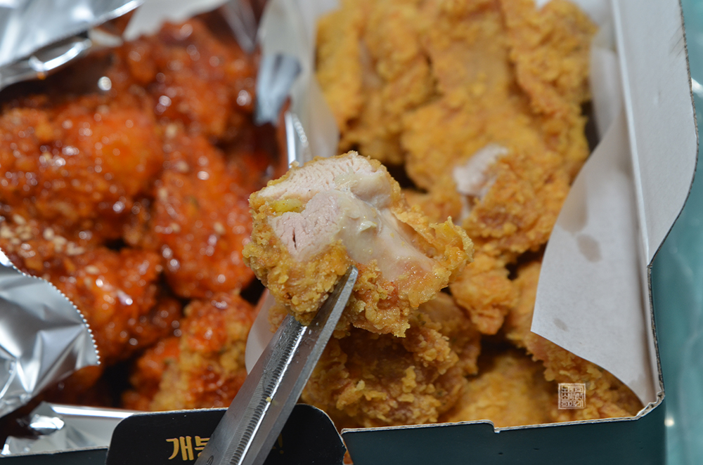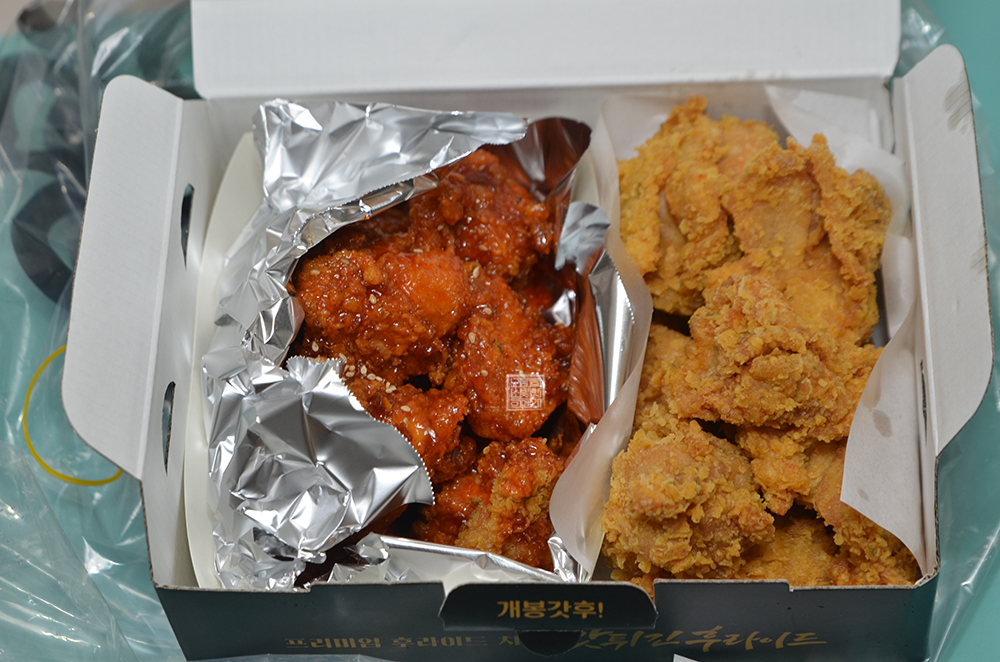 원래 나는 양념 한 마리 혹은 후라이드 한 마리를 하나로 통일해서 먹는 것을 좋아했지만, 갓튀긴후라이드 내외점에서 판매하는 치킨은 양이 많은 편에 속하다 보니 혼자 치킨을 먹을 경우에는 살짝 물리는 경우가 있었다. 그래서 일부러 한 마리를 주문할 때는 후라이드 양념 반반으로 주문해서 먹는다. 그렇게 해야 치킨이 물리지 않았다.