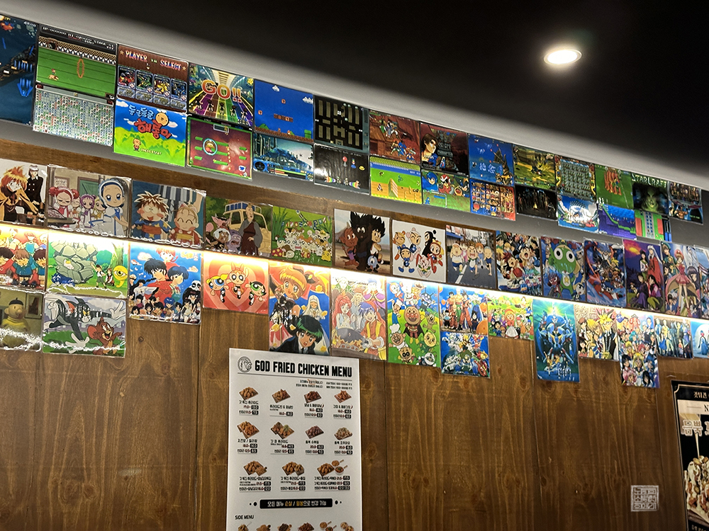 집에서 출발하기 전에 갓튀긴후라이드 내외점에 전화로 포장 주문을 한 이후, 자전거를 타고 출발하면 전화로 들었던 조리하는 데에 걸리는 10~15분 정도 시간을 딱 소요해서 도착할 수 있다. 보통 가게에서 5분 정도 기다리는 경우가 많은데… 가게 내부를 본다면 어릴 적 보았던 만화 애니메이션 포스터와 굿즈가 장식된 벽을 볼 수 있다.