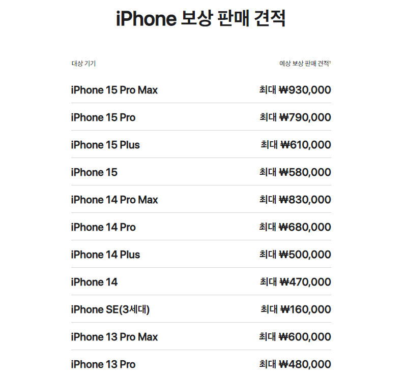 아이폰 16 시리즈는 그나마 가격이 약 30만 원 정도 저렴하게 판매되고 있었지만 그래도 절대 적은 금액이 아니었다. 아이폰 16 프로를 가능한 저렴하게 구매하려면 애플 트레이드 인을 통해 기존에 사용하는 아이폰 12 이상의 모델을 판매하고, 최소 20만 원에서 최대 93만 원의 보상을 받고 구매하는 것이다. 견적표는 다음과 같다.