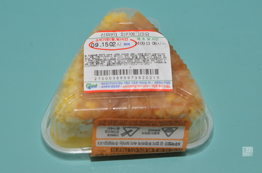 삐약이 신유빈의 간식타임 치킨에그마요의 포장지를 본다면 '속이 보이는 주먹밥'이라고 적혀 있다. 그렇다. 김이 들어가 김으로 포장된 삼각김밥이 아니라 젓가락으로 떠먹을 수 있는 주먹밥이었다. 제품 용기에는 '제품 구매 시 젓가락을 챙겨주세요.'라고 적혀 있는데, 아쉽게도 점원이 젓가락을 챙겨주지 않았다.