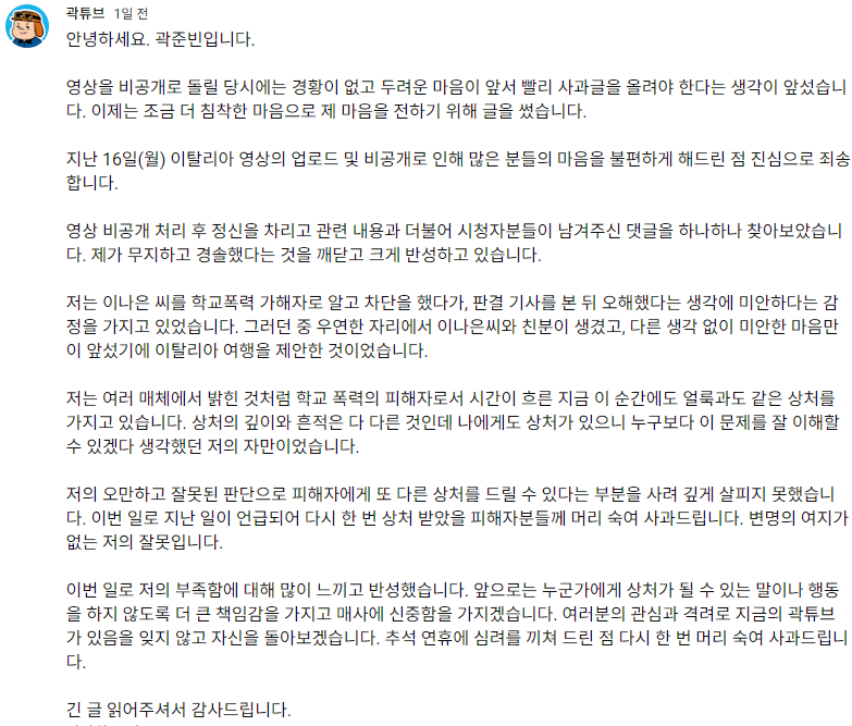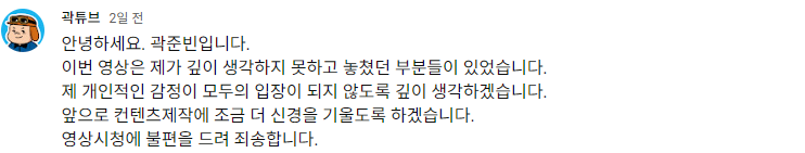 나는 지금이 곽튜브에게 굉장히 중요한 시기라고 생각한다. 사람은 한 차례 성공의 가도를 달리기 시작하면 반드시 넘어질 때가 온다고 한다. 이때 넘어지더라도 덜 다치는 것이 무엇보다 중요하다. 부디 곽튜브가 이번 논란에 크게 낙심하기보다 한 번은 겪어야 할 위기라고 생각하고 다음 장으로 잘 넘어갈 수 있었으면 한다.