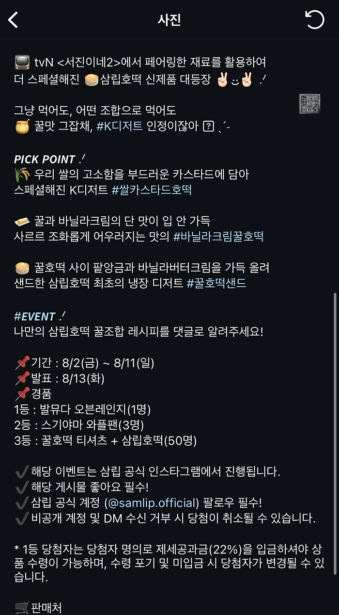 그리고 삼립 바닐라크림 꿀호떡 포장지에 적힌 'QR 이벤트도 참여하세요.'에 따라서 QR코드를 찍어 보았는데, 해당 이벤트는 이미 8월에 끝이 난 상태라 딱히 의미가 없었다. 삼립 바닐라크림 꿀호떡을 가지고 나만의 꿀조합 레시피를 만들어 인스타그램에 업로드한다면 여러 경품을 받을 수 있는 이벤트였는데 살짝 아쉽다.