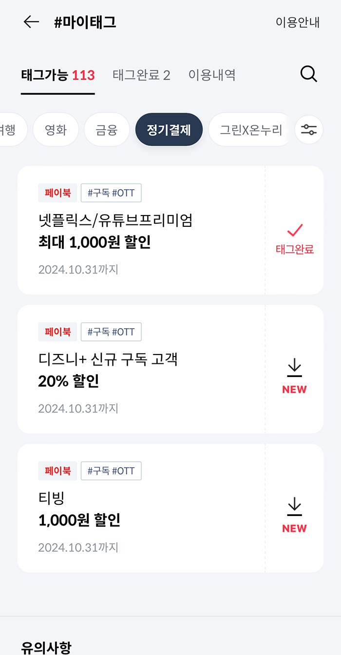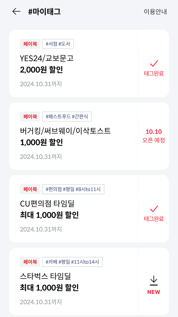 페이북 마이태그는 항상 월 초에 오픈되는 혜택만 아니라 추후 오픈되는 혜택도 있으니 꼭 챙기도록 하자.