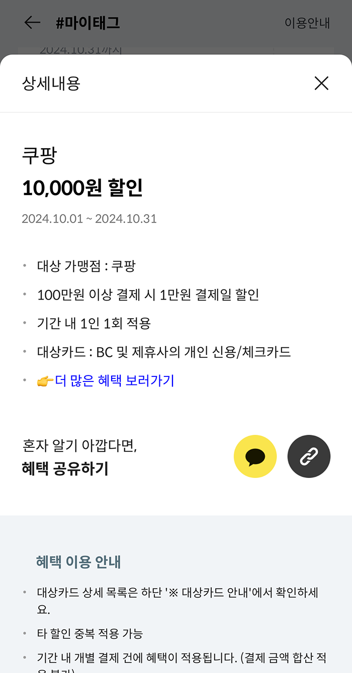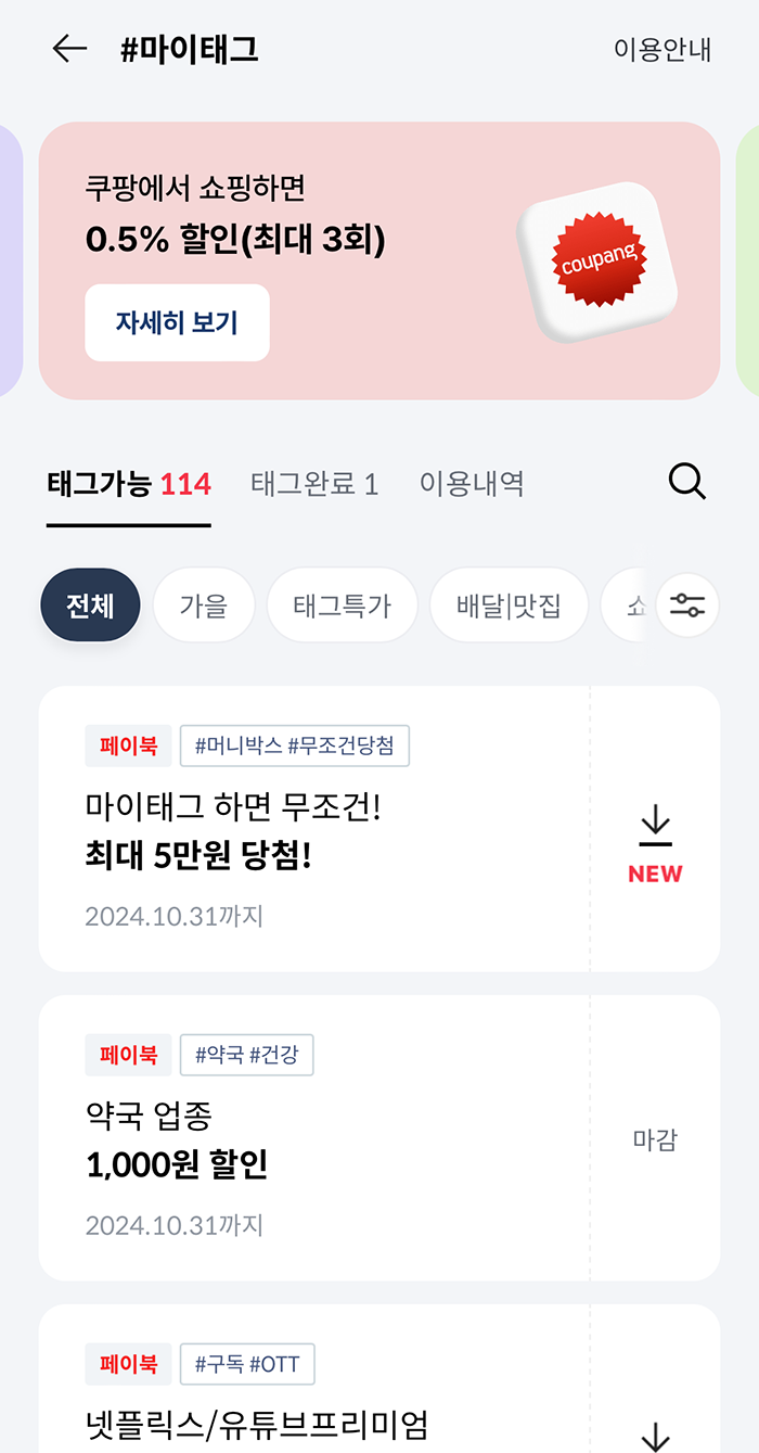 그리고 정기적으로 페이북 마이태그에서 꼭 챙겨야 하는 혜택 중 하나는 쿠팡 0.5% 할인이다. 쿠팡에서 1만 원 이상 결제 할 경우 결제일에 0.5% 할인을 받을 수 있는데, 혜택 내용을 본다면 최대 300원밖에 할인이 되지 않는 게 조금 그렇기는 해도 할인은 할인이니 챙기도록 하자. 1만 원 할인을 받으려면 100만 원을 써야 한다. (웃음)
