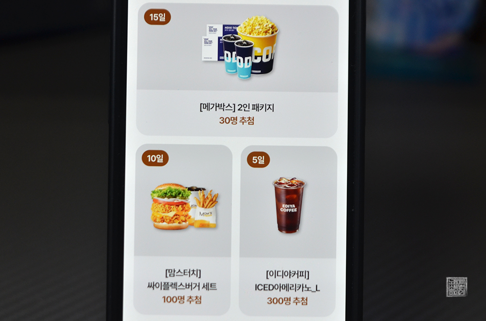 비싼 제품이 걸리면 당근으로 판매하거나 직접 사용할 수도 있고, 맘스터치 싸이플렉스버거 세트 기프티콘 같은 경우에는 인근 매장에서 밥 한 끼로 먹을 수 있어서 매력적이다. 지난 9월에 진행된 출석체크 이벤트 당첨자 발표는 언제 되는지 알 수 없지만, 부디 작은 행운이 나와 혹은 여러분과 함께 할 수 있었으면 하는 바람이다.