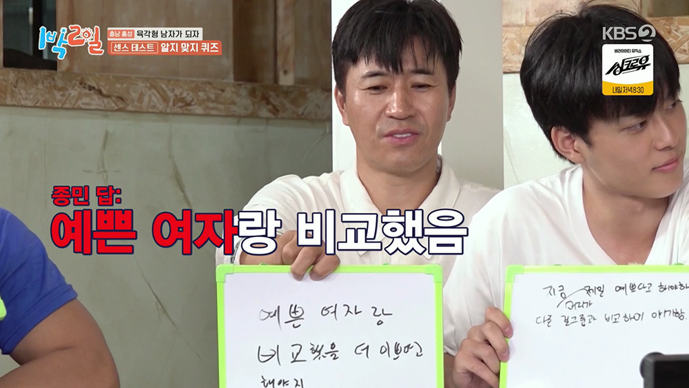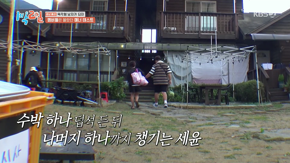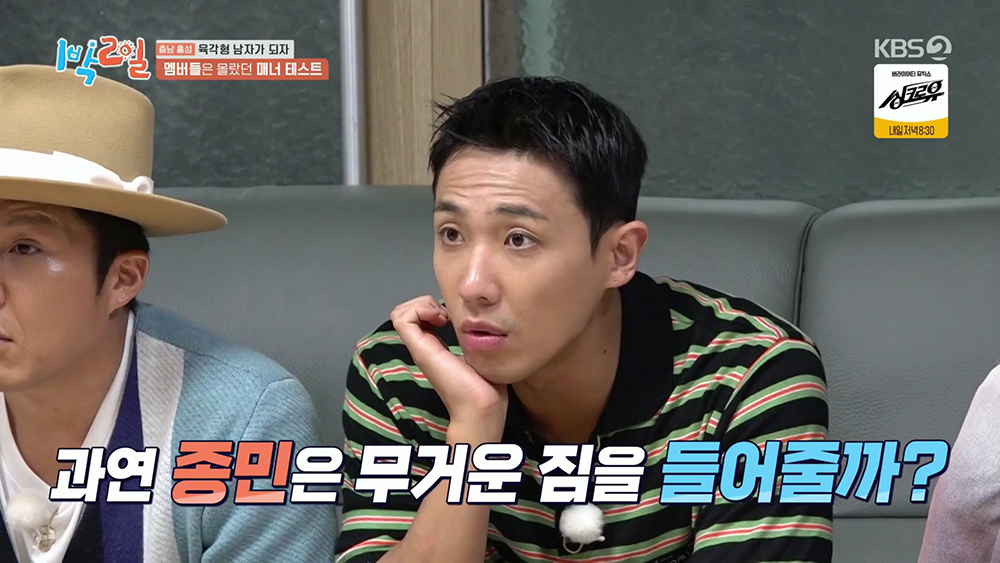 왜냐하면, 위 사진에서 볼 수 있는 자막에 들어간 '과연 종민은 무거운 짐을 들어줄까?'라는 질문에 '짐을 들어주었다.'라고 대답할 수 있는 행동을 한 멤버가 거의 없었기 때문이다. 문세윤 한 사람을 제외하고 1박 2일 나머지 멤버들은 무거운 짐을 낑낑거리며 옮기던 막내 작가를 보고도 손을 내밀어 도와주지 않았던 거다.