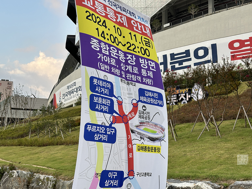 간단히 김해 종합 운동장의 모습을 둘러본 이후 차를 타고 내려오면서 찍은 사진은 위와 같다. 제105회 전국체전 개회식이 열리는 금요일(11일)에는 오후 2시부터 밤 10시까지 차량 통제가 진행되기 때문에 전국체전 개회식에 참여하기 위해서 김해 종합 운동장을 찾으려고 한다면 주의할 필요가 있다. 가급적이면 대중교통을 이용하자.