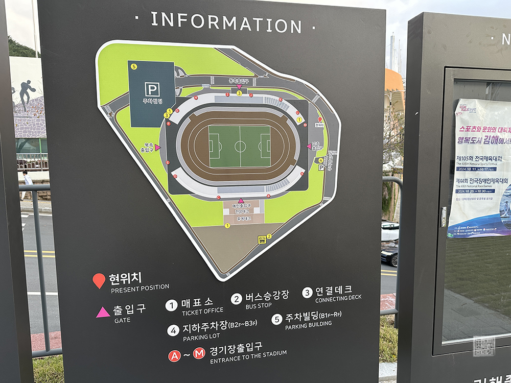 안내판을 본다면 김해 종합 운동장은 총 네 개의 출입구를 갖고 있었다. 메인 출입구와 함께 북측 출입구, 동측 출입구, 남측 출입구로 나누어져 있었는데… 구 김해 운동장과 김해시 체육회 사무실이 있는 건물에서 김해 종합 운동장으로 향하는 곳은 남측 출입구였다. 오, 이렇게 보니 김해 종합 운동장의 규모를 대충 가늠해 볼 수 있었다.