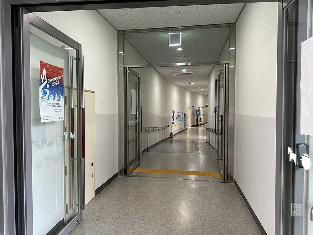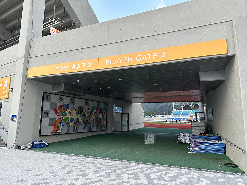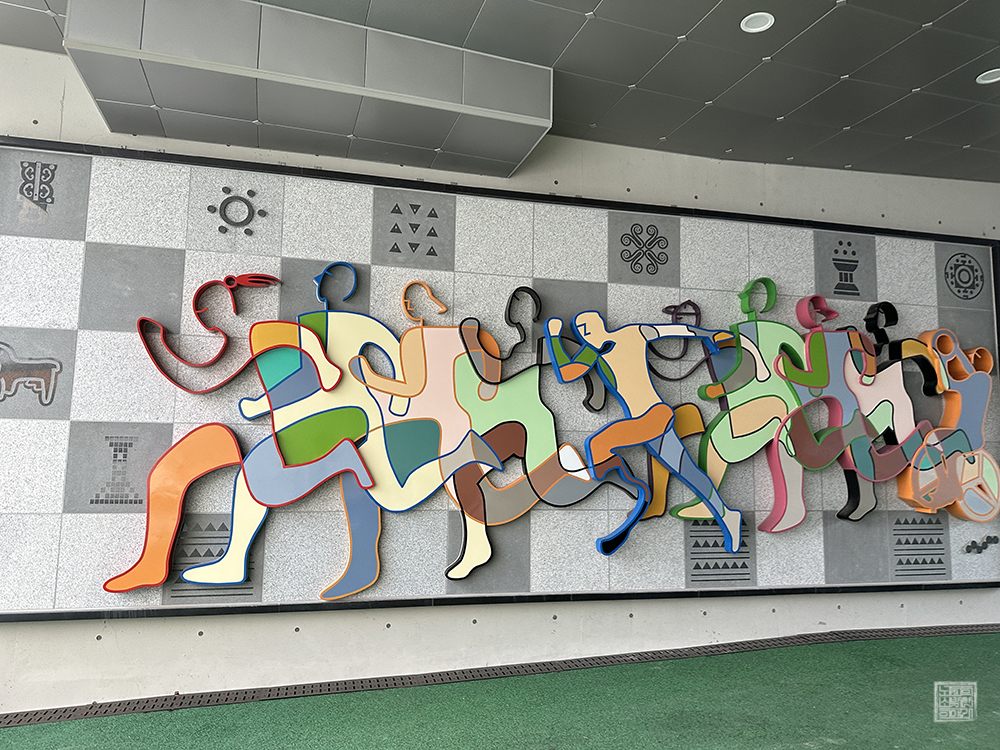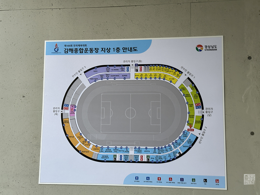 선수단 출입구 2번을 통해 김해 종합 운동장 내부로 들어간다면 위 사진을 통해 볼 수 있는 벽면을 만날 수 있다. 벽면에는 김해 종합 운동장 지상 1층 안내도(현 위치 기준)와 함께 전국체전에 참여하는 사람들을 상징하는 그림…이라고 말하기보다 전시물에 가까운 장식물이 아주 화려하게 한쪽 벽면을 채우고 있었다.