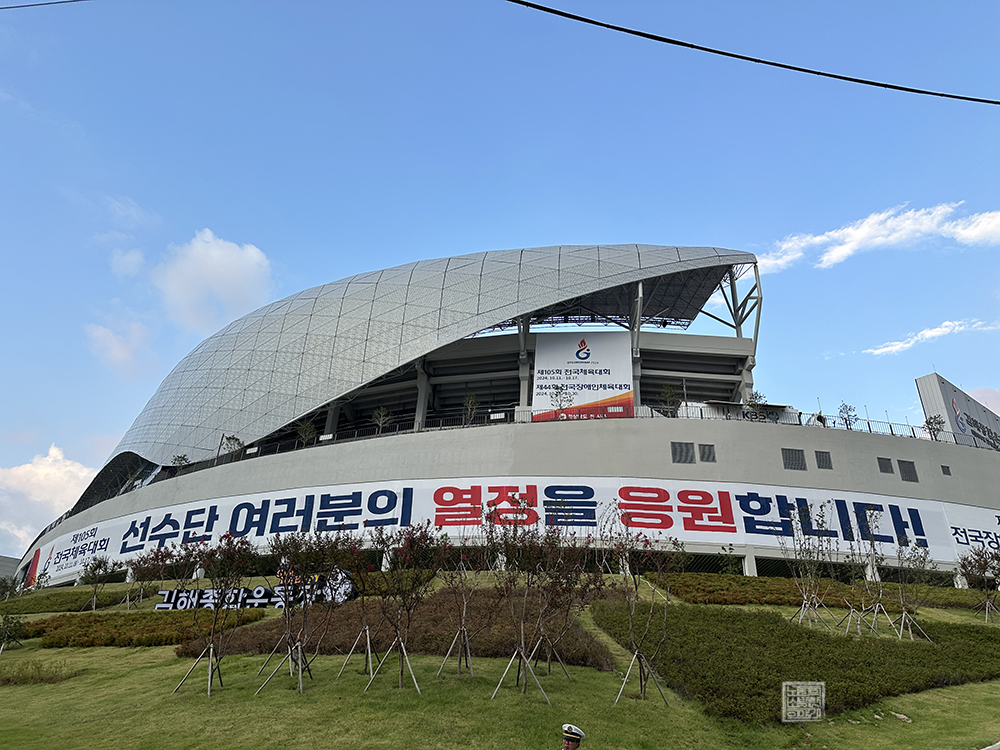 전국체전 개회식이 열리는 운동장을 짧게 둘러본 이후 길게 김해 종합 운동장 한 바퀴를 돌아보는 데에는 시간이 너무 걸릴 것 같아서 그냥 바로 나왔다. 당일(8일)을 기준으로 아직 여러 준비가 한창 진행되고 있다 보니 천천히 운동장을 둘러보면서 사진을 찍고 있으면 일하시는 분들이 종종 흠칫하시기 때문에 민폐가 될 것 같았다.