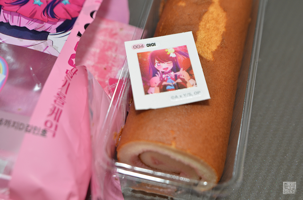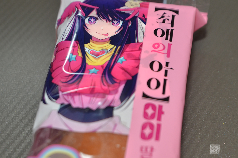 <최애의 아이 딸기롤케익>의 포장지를 본다면 <최애의 아이>라는 작품의 인기를 이끌었던 첫 번째 주인공이라고 말할 수 있는 호시노 아이의 모습이 예쁘게 그려져 있다. 이 모습은 <최애의 아이>라는 작품을 아는 사람이라면 모를 수가 없는, 만화 <최애의 아이 1권>의 표지를 장식한 아이의 모습이다. 설마 아이를 이렇게 볼 수 있다니…!