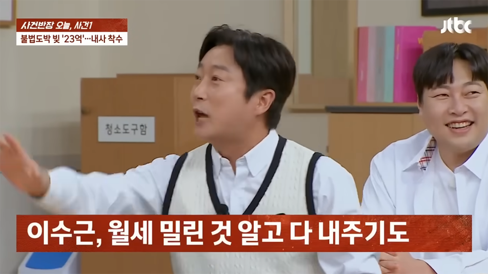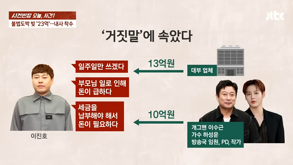 JTBC 사건반장을 통해 보도된 내용을 본다면 동료 개그맨 이수근은 이진호가 위독한 어머니를 간호하느라 생긴 빚이라고 생각해서 밀린 월세를 내줬을 뿐만 아니라 일부 빚을 직접 변제를 해 주었다고 한다. 하지만 알고 보니 어머니가 아파서 고생을 하는 상황 속에서도 이진호는 불법 도박의 늪에 빠져 있었다는 사실이 밝혀졌다.