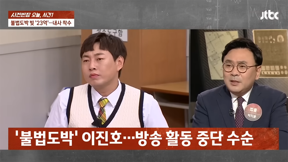 <코미디빅리그>와 <아는 형님> 등 복수의 예능 프로그램에 출연하면서 이름을 알리고 있던 개그맨 이진호가 불법 도박을 했다는 것을 스스로 밝히면서 경찰 출석했다. 소위 말하는 불법 토토를 하면서 소액을 잃어버린 게 아니라 여러 연예인들과 방송국 관계자들에게 수십억 원에 달하는 돈을 빌려 모두 도박으로 탕진했다고 한다.