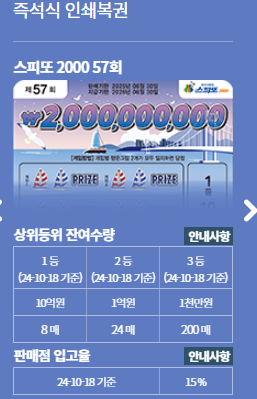 판매점 입고율 97%를 기록하고 있는 스피또 1000 84회는 현재 5억 원을 받을 수 있는 1등의 잔여수량이 1장, 2천만 원을 받을 수 있는 2등의 잔여수량이 22장 남게 되자 스피또 1000 85회가 새롭게 판매