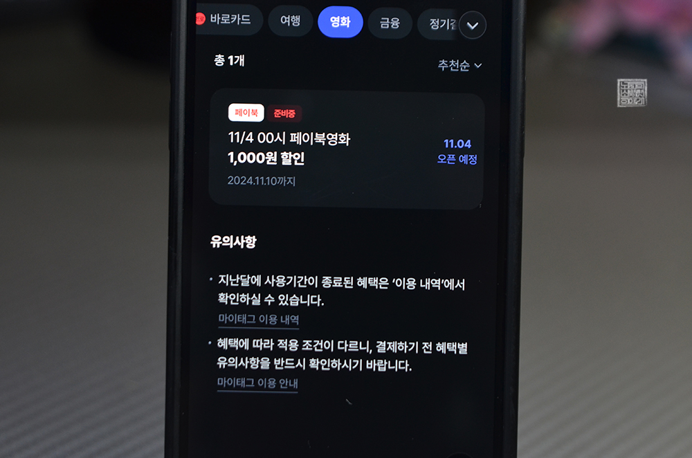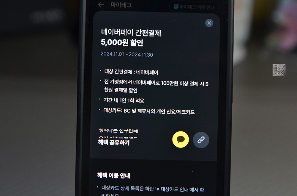 물론, 쇼핑도 돈이 있어야 할 수 있는 것이다 보니 돈이 없는 나는 11월 01일(금)을 맞아서 BC카드 페이북 어플에 접속했다. 매달 정기적으로 받을 수 마이태그 할인 혜택은 금액이 크지 않더라도 놓치면 손해고, 나처럼 돈이 없어서 아직 이전 달의 카드값도 해결하지 못한 사람들은 500원~1,000원 할인도 무척 중요했다.