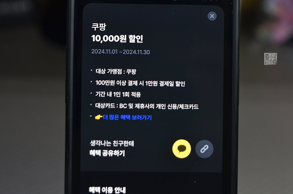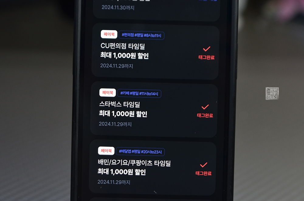 그래서 나는 페이북 어플 같은 곳을 통해 받을 수 있는 할인 혜택이라도 챙기기 위해 노력하고 있다. 100만 원 이상 금액을 결제할 경우 받을 수 있는 할인 혜택은 그림의 떡일 뿐이지만, CU편의점 타임딜(오전 8시~오전 11시 결제 시 최대 1천 원 할인)을 비롯해서 종종 배달 음식을 먹을 때 이용하는 배민과 쿠팡이츠 등의 할인 혜택은 유용했다.