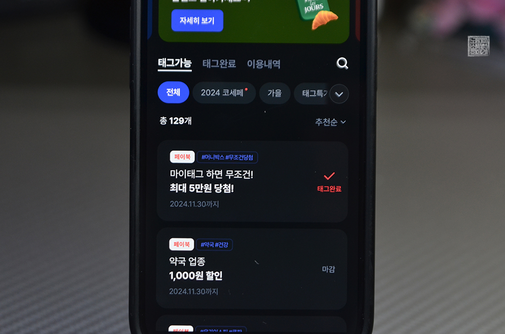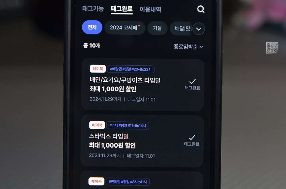 대충 그렇게 마이태그를 열심히 태그 하다 보니 11월도 내가 받을 수 있는 혜택은 다 챙긴 것 같다. 11월 페이북 마이태그에 새롭게 등록된 로컬 브랜드는 거의 서울 쪽이었기 때문에 나와 인연이 없었고, 다른 마이태그도 영 인연이 없는 카테고리가 많다 보니 개인적으로 조금 아쉽다. 그냥 편의점 할인 혜택을 좀 늘려주면 좋을 텐데…(웃음).