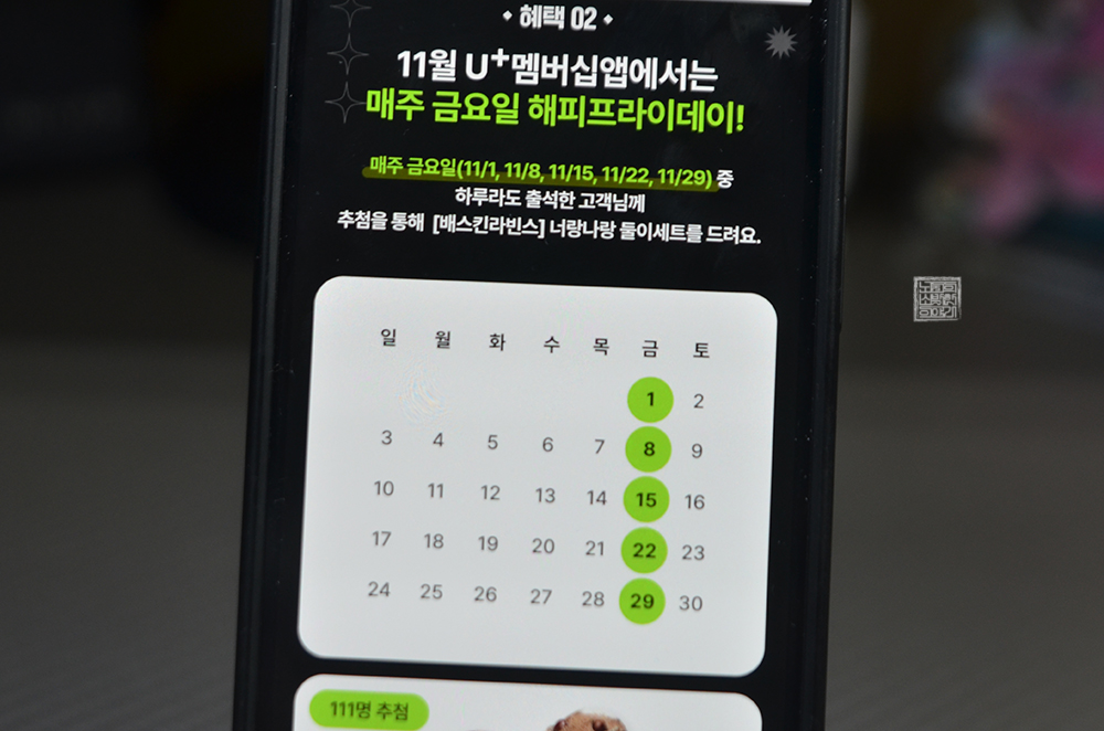 나는 분명히 일요일 아침에 눈을 뜨자마자 출석체크를 했다고 생각했었는데 알고 보니 하지 않았던 것 같다. 오는 11월을 맞아서 모바일 유플러스 닷컴에서 진행 중인 출석체크 이벤트에서도 매력적인 상품이 많기 때문에 절대 놓치지 않으려고 했는데…. 비록 일요일 출석체크를 하나 놓쳤다고 해도 아직 기회는 남아 있었다.