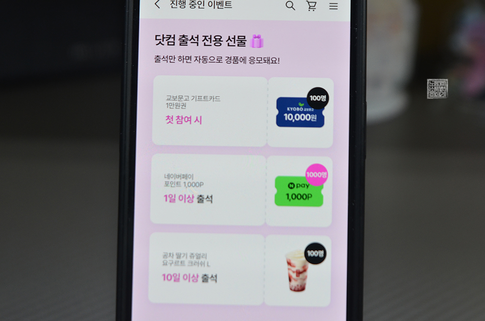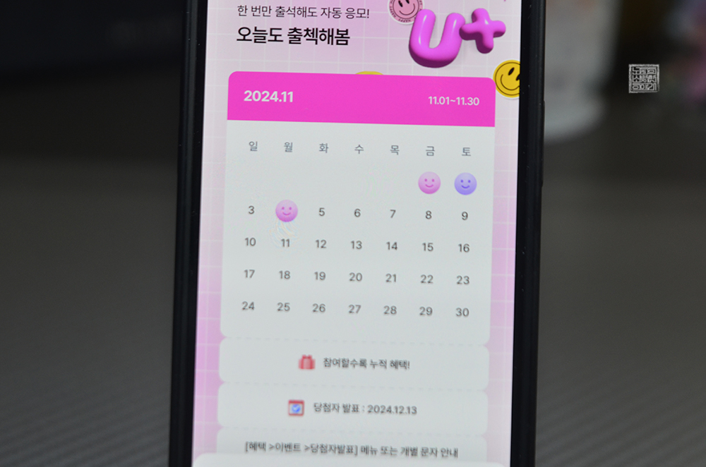 2024년 11월을 맞이하고 벌써 4일 차가 되었다. 4일이 지난 만큼 우리는 11월을 맞아 꼭 실천하겠다고 다짐한 일 중 절반은 실천하지 못했거나 혹은 계속 실천하고 있을 것으로 생각하는데, 그중에서 나는 여러 상품을 받을 수 있는 출석체크 이벤트에 계속 응모하고 있다. 그렇게 생각했는데… 일요일에 출석체크를 하지 못했다.