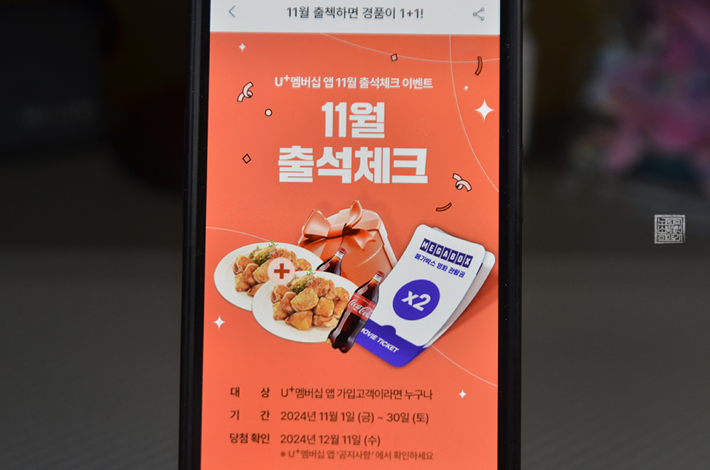 그리고 유플러스에서는 유플러스 닷컴 모바일만 아니라 유플러스 멤버십 모바일에서도 출석체크 이벤트가 따로 진행되고 있다. 유플러스 멤버십(즉, 유플러스 모바일 통신 이용자)이라면 누구나 참여할 수 있는 출석체크 이벤트로, 여기서는 25일 이상 출석체크를 할 경우 굽네치킨 오리지널 순살과 콜라 1.25L 세트 2개를 받아볼 수 있다.