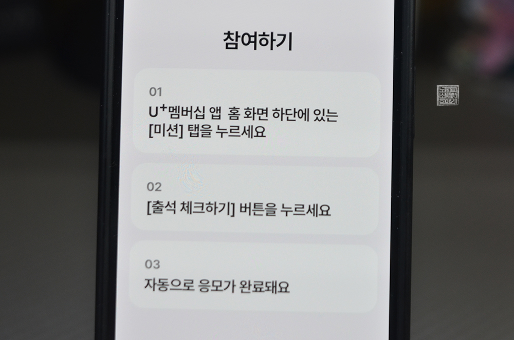 모바일 유플러스 닷컴에서 출석체크에 첫 참여를 할 경우 추첨을 통해 100명에게 교보문고 기프트 카드 1만 원 권을 주고, 1일 이상 출석할 경우 1,000명을 추첨해서 네이버페이 1천 원을 준다. 그리고 10일 이상 출석할 경우 100명을 추첨해서 공차 딸기 쥬얼리 요구르트 크러쉬 L을 먹을 수 있는 기프티콘을 받을 수가 있다.
