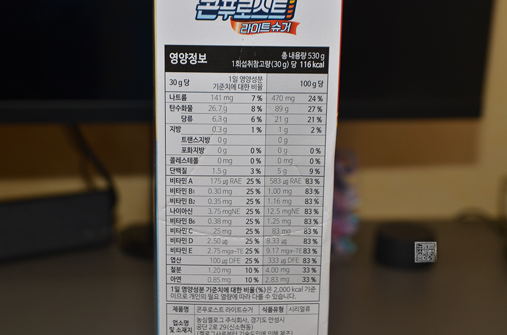 콘푸로스트 라이트 슈거 상자 뒷면을 본다면 한 그릇(30g) 기준으로 섭취할 수 있는 단백질과 칼슘, 비타민C 등이 정리되어 있다. 솔직히 집에서 시리얼 한 그릇 먹을 때 상자에 표기된 한 그릇의 표준 중량(30g)을 지켜서 먹는 사람은 드물지 않을까? 나 같은 경우에는 그냥 적당히 그릇에 부어서 먹곤 했었다.