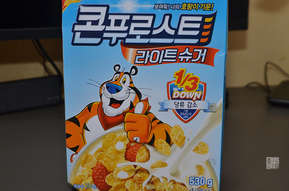 켈로그에서 판매하는 콘푸로스트 라이트 슈거는 이름 그대로 설탕이 덜 들어간 콘푸로스트인데, 상자를 본다면 1/3 기존 콘푸로스트 대비 1/3 당류 감소가 적혀 있다. 그만큼 당 걱정을 덜고 먹을 수 있는 시리얼이라고 생각하지만, 당이 떨어진 만큼 단맛이 떨어져서 사람들에게 호불호가 나누어지는 듯했다.