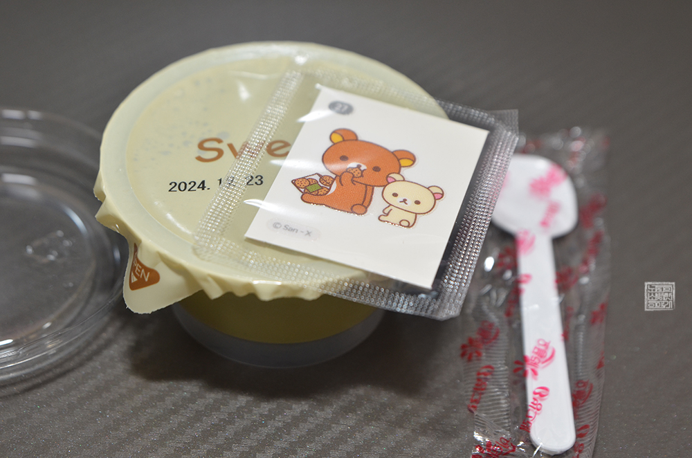 리락쿠마 말차 푸딩은 말차 1.5%(녹차 100%)가 함유된 제품으로, 총 용량 90g이기 때문에 가벼운 간식으로 먹기에 부족하지 않았다. 위에서 첨부한 사진을 본다면 리락쿠마 말차 푸딩을 구매해서 받을 수 있는 리릭쿠마 스티커도 귀여웠고, 말차 푸딩은 딱 말차 푸딩답게 진하지는 않아도 분명한 말차 향기도 확실하게 났었다.