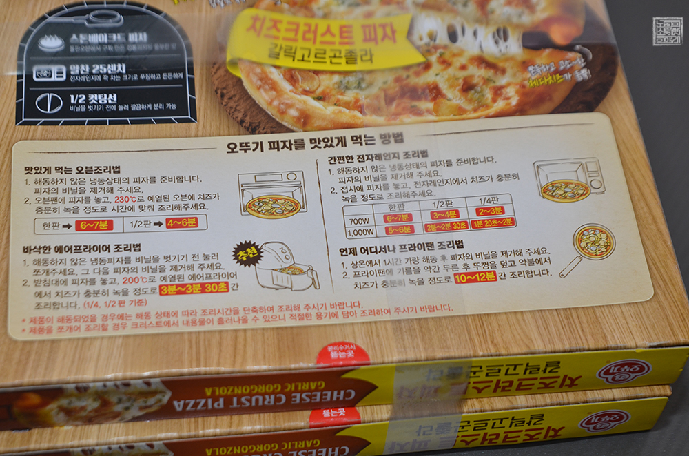 오뚜기 냉동 피자 치즈크러스트 갈릭고르곤졸라 상자를 본다면 전자레인지로 한판을 돌릴 경우 700W 제품은 6~7분, 1,000W 제품은 5~6분을 돌려주라고 적혀 있다. 나는 우리 집 전자레인지 규격을 모르다 보니 그냥 6분을 돌렸었는데… 피자는 지나치지 않고 이븐하게(?) 잘 익었다고 생각한다. 이게 바로 냉동 피자의 묘미다.