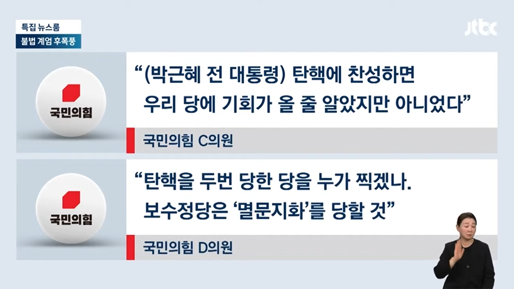 더욱이 어처구니 없게도 국민의힘 소속 국회의원들은 대통령을 옹호하면서 "대통령이 얼마나 힘들었으면 오판을 했겠나, 108명 중에 얘기할 사람이 한 명도 없었을 정도로 당·정이 문제."라고 주장했고, 어떤 국민의힘 의원은 "탄핵을 두 번 당한 당을 누가 찍겠나. 보수정당은 '멸문지화'를 당할 것"이라고 언급하기도 했었다.