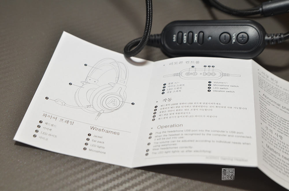 하지만 묵직한 만큼 내구도를 어느 정도 갖추고 있다고 해석할 수도 있다고 생각한다. 에이투 가상 7.1 채널 진동 RGB 마이크 게이밍 헤드셋의 리모콘은 볼륨 조절 버튼만 아니라 마이크 ON/OFF 버튼과 함께 LED ON/OFF 버튼, 진동 ON/OFF 버튼이 부착되어 있어 게임을 하면서 손쉽게 마이크의 ON/OFF 할 수 있어서 편했다.