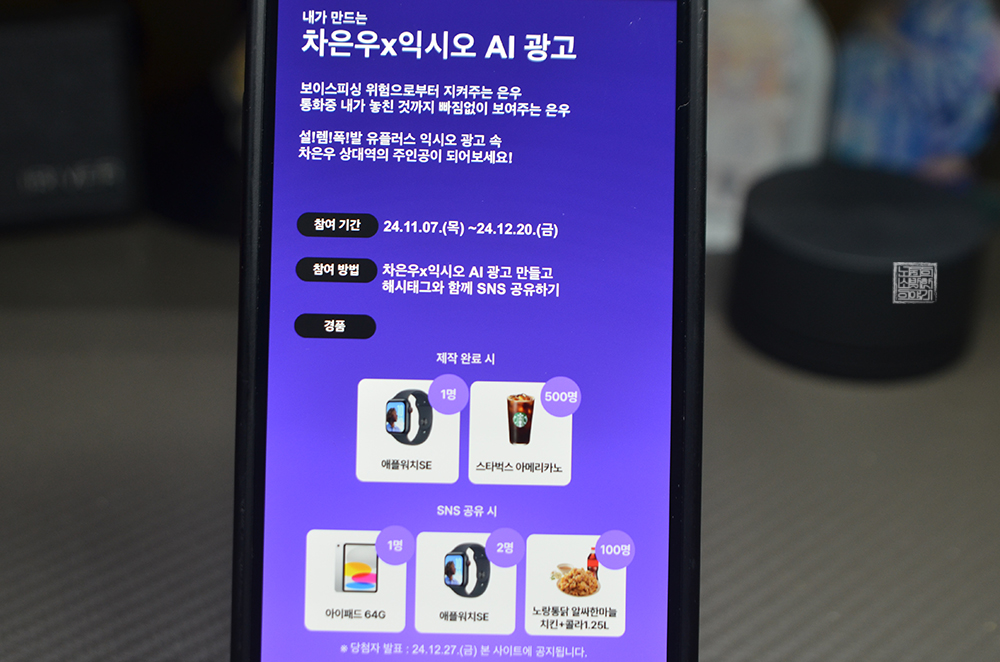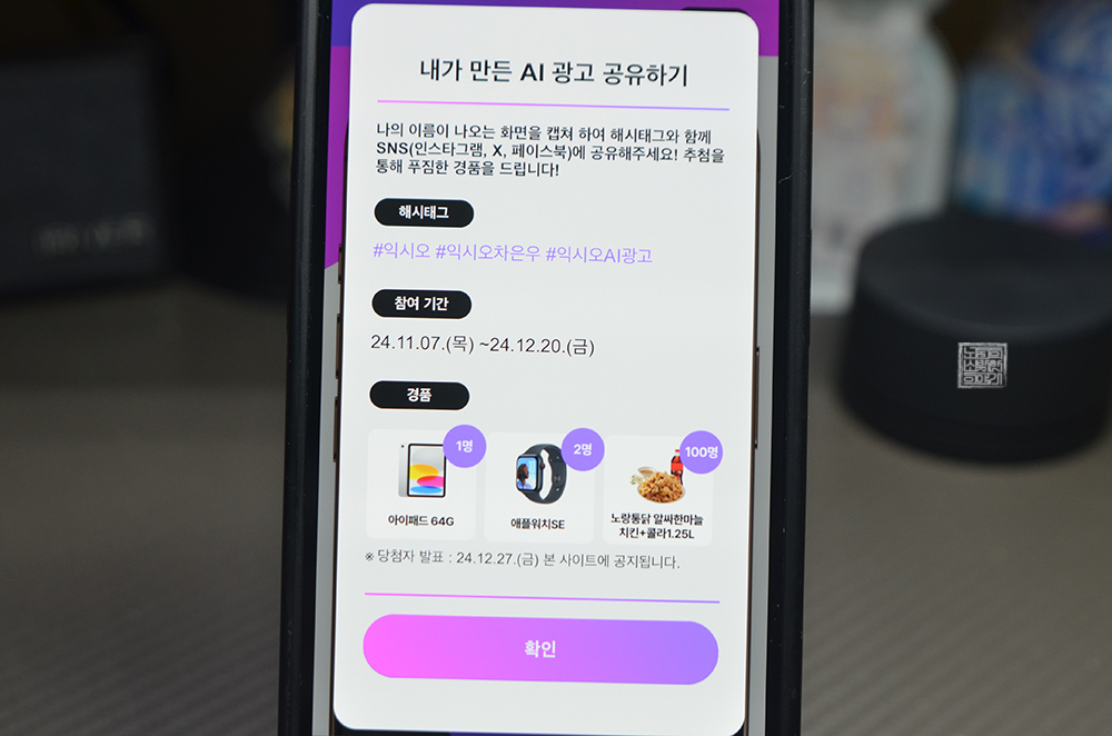 유플러스 익시오 이벤트 페이지에서 AI 광고 제작 완료만 하는 것으로도 애플워치 SE를 받을 수 있는 기회가 있고, SNS 공유를 할 경우 다운로드 이벤트와 마찬가지로 아이패드 64G 모델과 애플워치 SE, 노란 통닭 알싸한 마늘 치킨+콜라 1.25L 세트를 받을 수 있는 기회가 있었다. 아주 간단히 응모할 수 있는 이벤트라 나는 모두 참여했다.