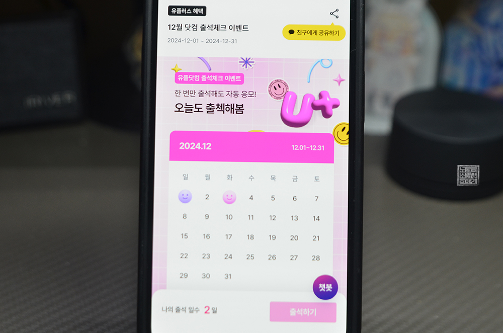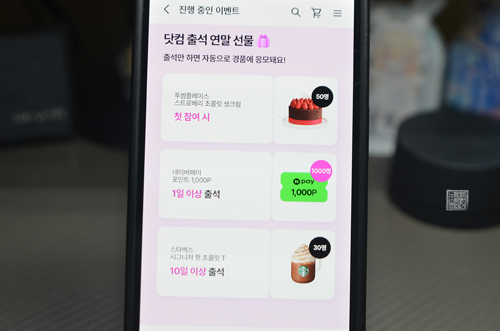 나는 12월이 시작되자마자 내가 사용하는 앱에서 참여할 수 있는 출석 체크 이벤트를 비롯해 새롭게 오픈된 이벤트에 열심히 참여하고 있다. 돈이 없는 서민으로 살아가다 보니 이렇게 '꾸준함' 하나로 참여할 수 있는 이벤트는 놓칠 수가 없기 때문이다. 하지만 마음은 그래도 출석체크는 벌써 며칠을 잊어버리고 말았다.