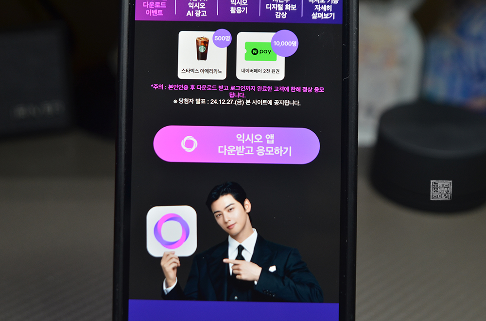 차은우 X익시오 AI 광고 이벤트는 여기서 끝이 아니다. 익시오를 다운받을 수 있는 페이지에서 AI로 직접 나만의 광고를 생성해서 해시태그와 함께 SNS로 공유하는 이벤트도 하나 더 있었다.