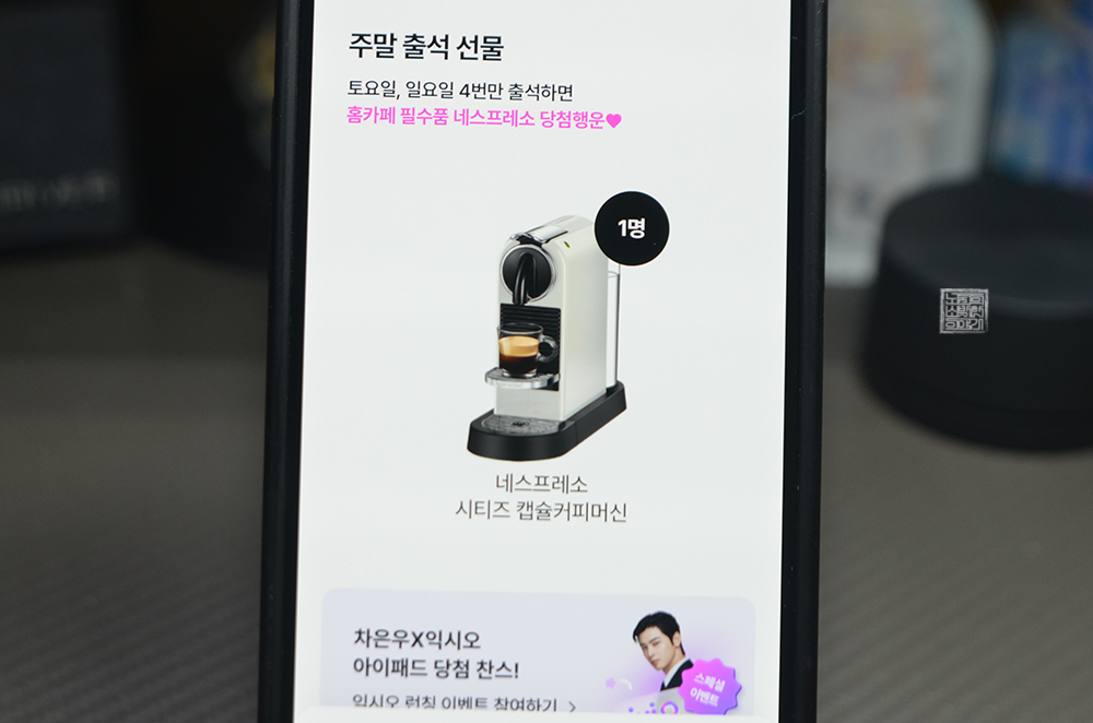 그리고 평일에 출석이 어려운 사람들을 위해서 주말만 4번 출석해도 특별한 이벤트 상품을 받을 수 있는 기회가 주어진다. 위에서 첨부한 사진에서 볼 수 있는 주말 출석 선물인 홈카페 필수품 네스프레소 시티즈 캡슐커피머신이 이번 12월의 선물이다. 본격적으로 시작된 겨울에 집에서 마시는 따뜻한 커피 한 잔이라니!