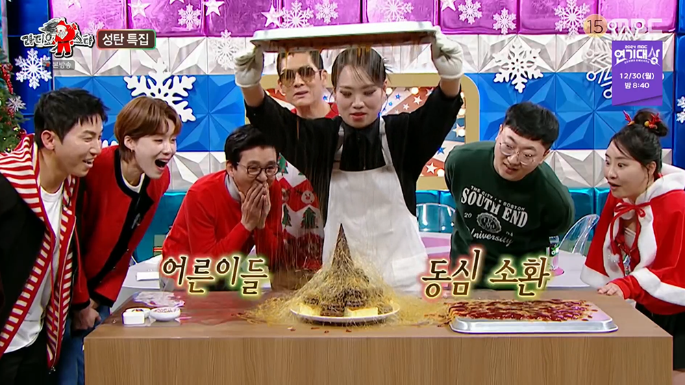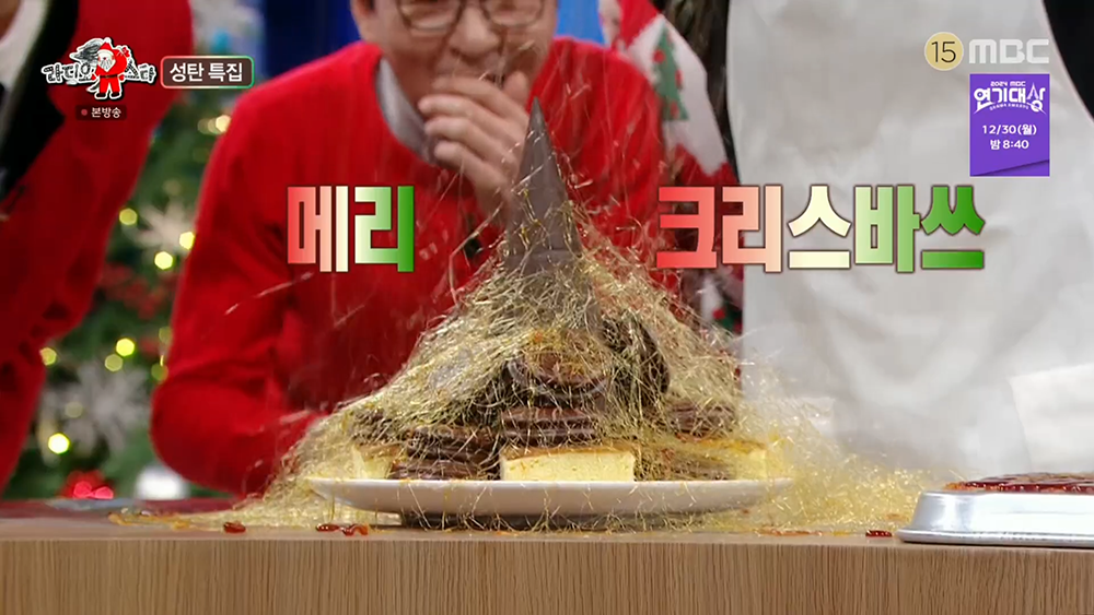 설탕으로 만들어진 실을 뽑아내는 정지선 셰프의 모습을 보면서 MC들과 출연진은 모두 놀라서 입을 다물지 못했다. <흑백요리사>에서만 보았을 그 바쓰를 이렇게 깔끔히 뽑아낼 수 있다는 게 놀라웠는데, 딱 크리스마스 장식에 어울리는 황금색 실로 나온 바쓰가 초코 과자 위에 수북이 쌓이는 모습은 말이 필요 없을 정도로 장관이었다.