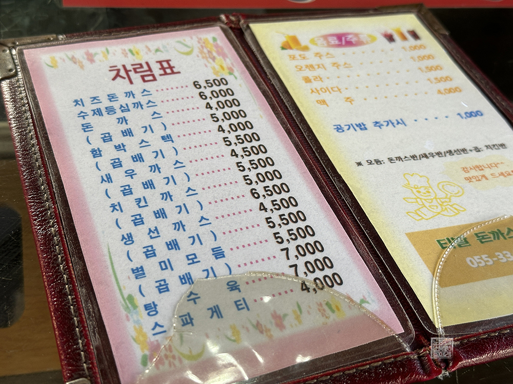 하지만 오랜 세월 동안 변함 없는 모습을 고집(?)하는 듯한 티발 돈까스의 집은 물컵도 세월의 흔적이 있었다. 그러니 정 이런 물컵을 이용하는 게 꺼려진다면 개인 생수 한 병 작은 걸 구매해서 가방에 넣어 가는 것도 나쁘지 않을 것이다. 추억이 있기는 해도 이런 부분에 신경을 쓰면서 여러 생각을 하다 보니 돈까스가 나왔다.