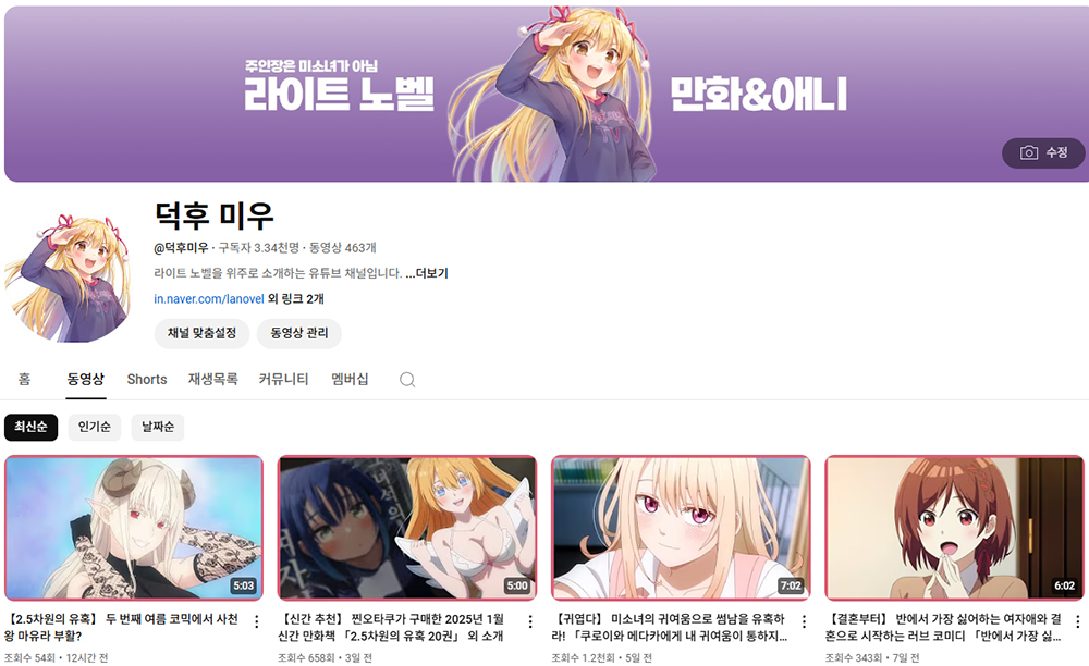 언젠가 센님처럼 내가 좋아하는 일본어 혹은 내가 좋아하는 일본 콘텐츠로 크게 성공할 수 있으면 좋겠지만, 아직은 내가 운영하는 라이트 노벨과 만화책 소개 유튜브 채널은 이제 3천 명 남짓한 구독자라 멀기만 하다. 하지만 일본어 공부도 처음에는 어려웠지만 좋아해서 열심히 덕질을 하다 보니 유창해진 것처럼 유튜브도 그렇게 되지 않을까?