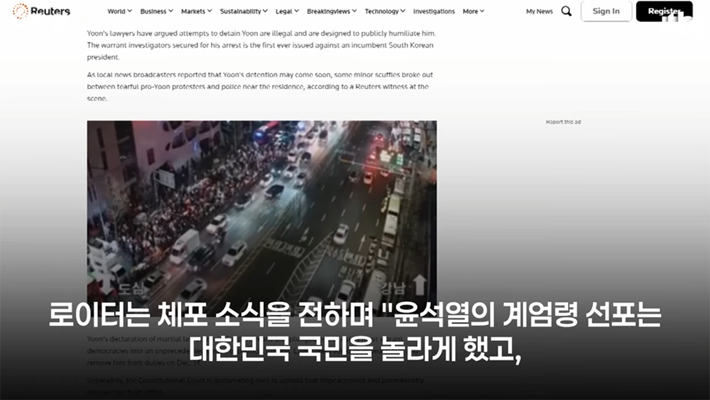 로이터 통신은 윤석열 대통령이 저지른 위법한 비상계엄에 대해 "윤석열의 계엄령 선포는 대한민국 국민을 놀라게 했고, 아시아에서 가장 활기찬 민주주의 국가인 한국을 전례 없는 정치적 혼란으로 몰아넣었다."라고 평가했다. 극우 세력과 한 몸이 되어가는 국민의힘은 해외 언론의 객관적인 평가를 똑바로 받아들일 수 있어야 한다.