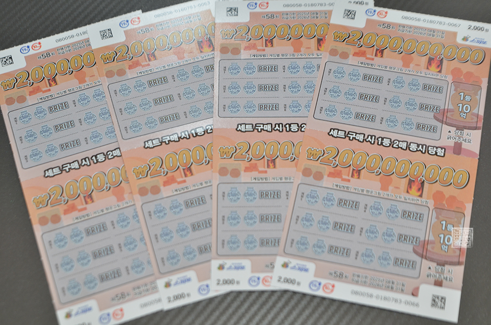 어제 중고로 컴퓨터 파워를 1만 원에 판매한 이후 수중에 있던 당첨된 스피또2000 58회 복권과 함께 평소 이용하는 복권 판매점을 찾아 즉석복권 스피또2000 58회 6장을 구매했다. 현재 스피또2000 58회는 1월 10일을 기준으로 판매점 입고율이 47%, 1등은 6장 2등은 14장, 3등은 133장이 남아 있는 상태였다.